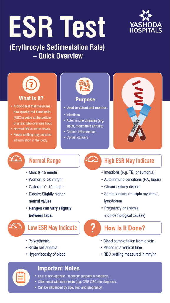 If the doctor suspects high levels of inflammation in the body, they may advise a blood test called an ESR (erythrocyte sedimentation rate) test. An ESR is a test performed in a blood sample that quantifies how fast erythrocytes, i.e., RBC (red cells), settle at the bottom of a test tube.