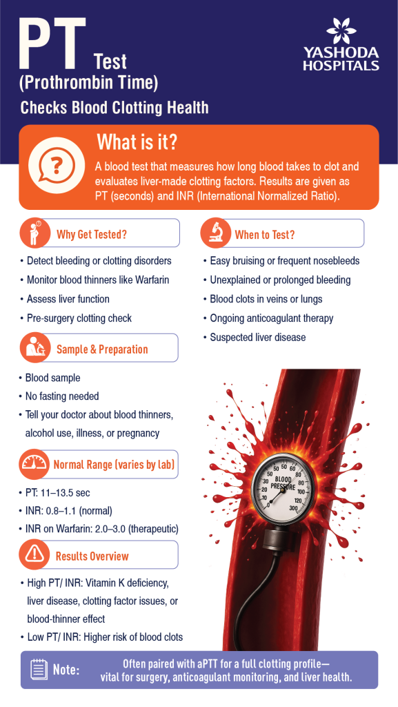 The prothrombin time test is an investigation to measure blood clotting. The prothrombin time test is vital. The prothrombin time helps to know how long it may take for your blood to clot. It may be known as PT or pro time test. Prothrombin is a protein synthesised by your liver. Prothrombin is one of the clotting factors. It is also known as clotting factor 2. It may be one of the factors in your blood that helps blood clot or coagulate.