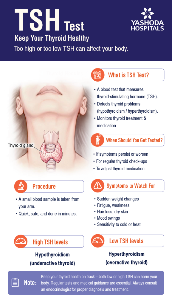 A thyroid-stimulating hormone test (TSH) evaluates the level of thyroid hormone in the blood via a blood test. The thyroid gland has a butterfly shape and is located near the throat, which synthesizes hormones that determine the body’s metabolism, development, and growth.