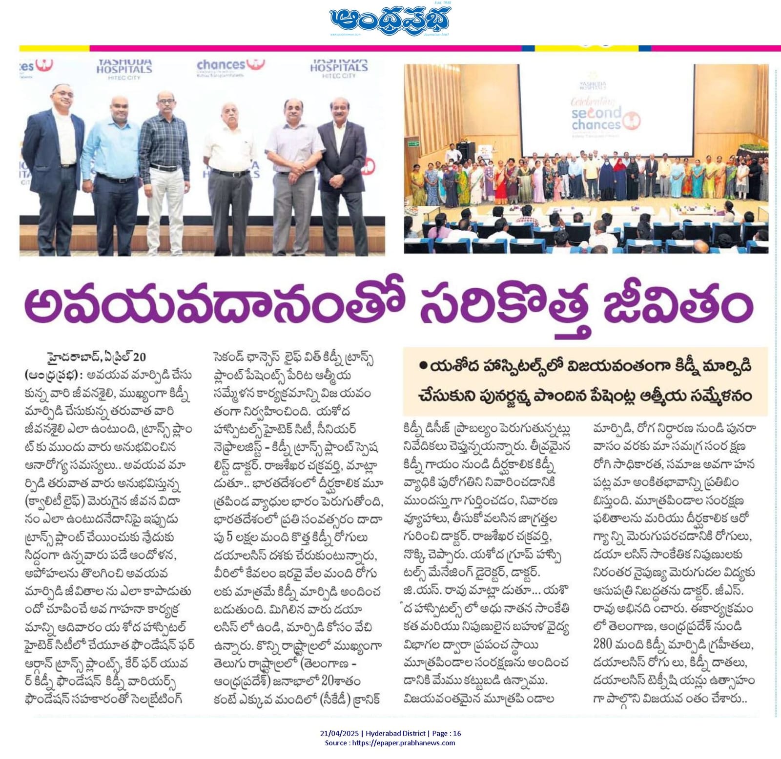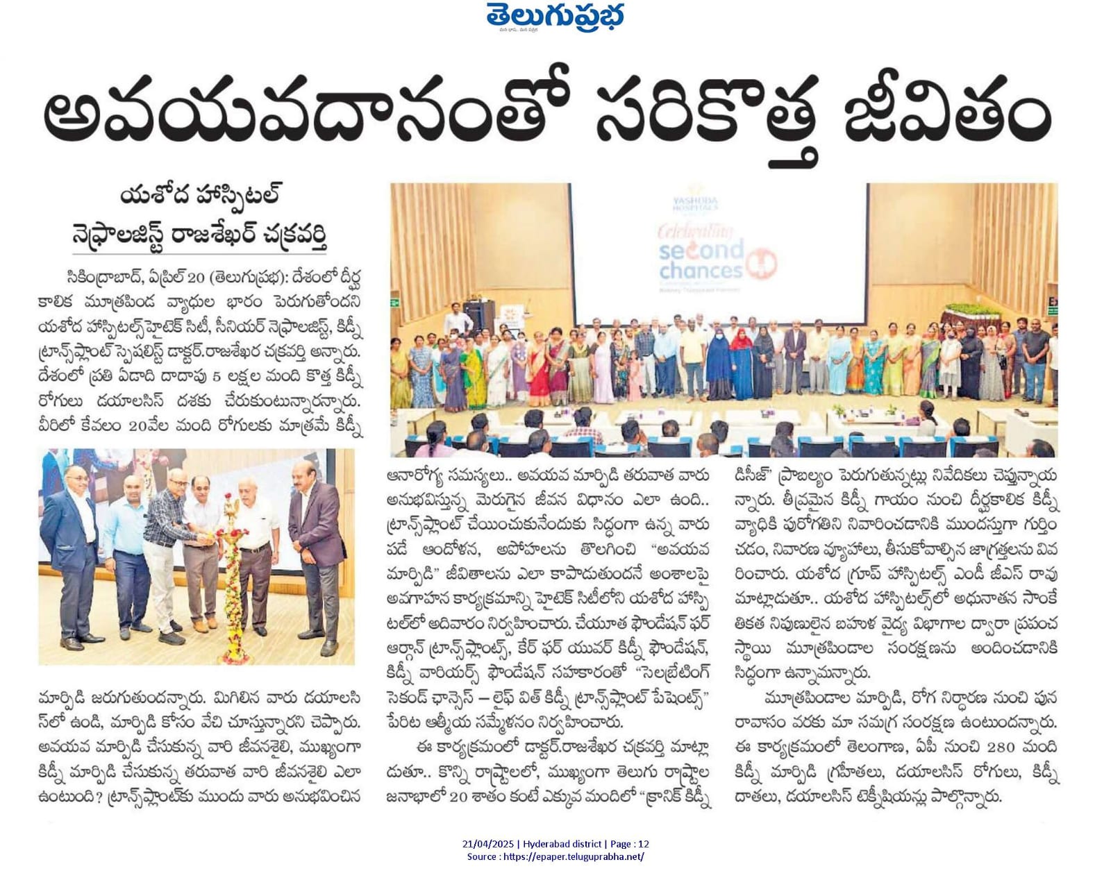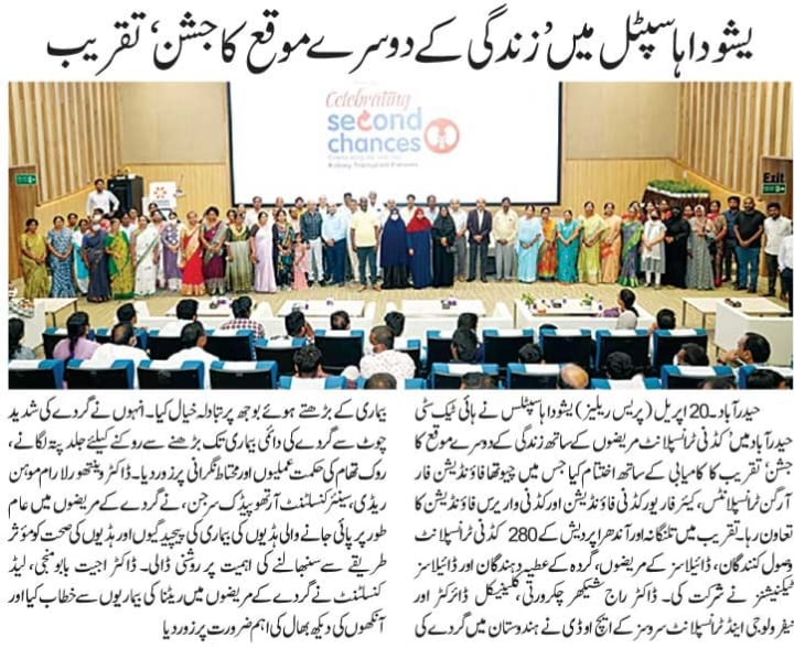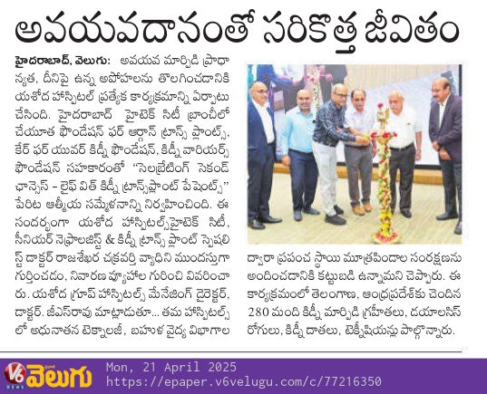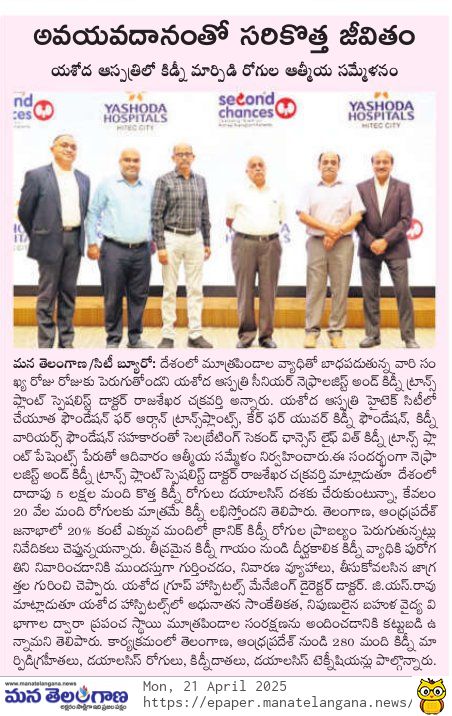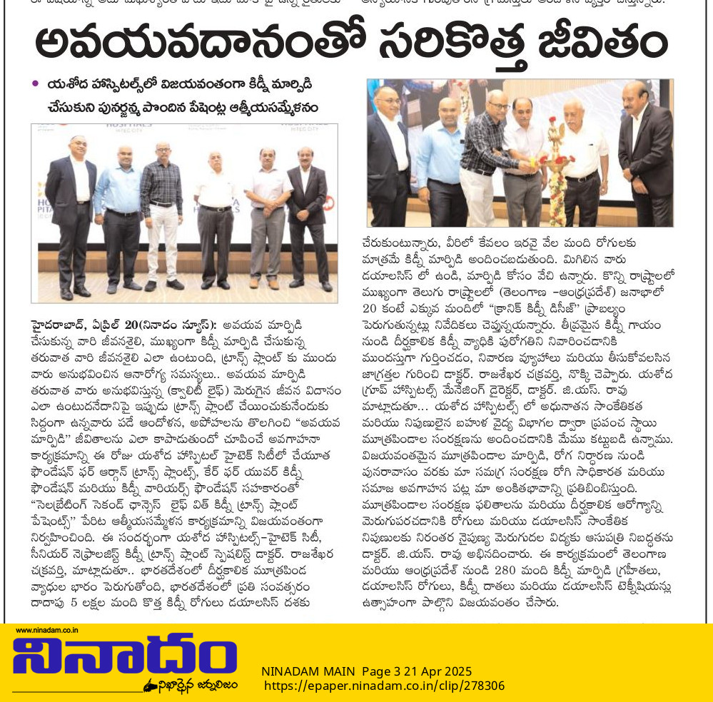 హైదరాబాద్, ఏప్రిల్ 20, 2025: అవయవ మార్పిడి చేసుకున్న వారి జీవనశైలి, ముఖ్యంగా కిడ్నీ మార్పిడి చేసుకున్న తరువాత వారి జీవనశైలి ఎలా ఉంటుంది? ట్రాన్స్ ప్లాంట్ కు ముందు వారు అనుభవించిన ఆనారోగ్య సమస్యలు, అవయవ మార్పిడి తరువాత వారు అనుభవిస్తున్న (క్వాలిటీ లైఫ్) మెరుగైన జీవన విధానం ఎలా ఉంటుదనే దానిపై ఇప్పుడు ట్రాన్స్ ప్లాంట్ చేయించుకునేందుకు సిద్దంగా ఉన్నవారు పడే ఆందోళన, అపోహలను తొలగించి “అవయవ మార్పిడి” జీవితాలను ఎలా కాపాడుతుందో చూపించే అవగాహనా కార్యక్రమాన్ని ఈరోజు యశోద హాస్పిటల్ హైటెక్ సిటీలో, చేయూత ఫౌండేషన్ ఫర్ ఆర్గాన్ ట్రాన్స్ ప్లాంట్స్, కేర్ ఫర్ యువర్ కిడ్నీ ఫౌండేషన్ మరియు కిడ్నీ వారియర్స్ ఫౌండేషన్ సహకారంతో “సెలబ్రేటింగ్ సెకండ్ ఛాన్సెస్ – లైఫ్ విత్ కిడ్నీ ట్రాన్స్ ప్లాంట్ పేషెంట్స్” పేరిట ఆత్మీయసమ్మేళన కార్యక్రమాన్ని విజయవంతంగా నిర్వహించింది.