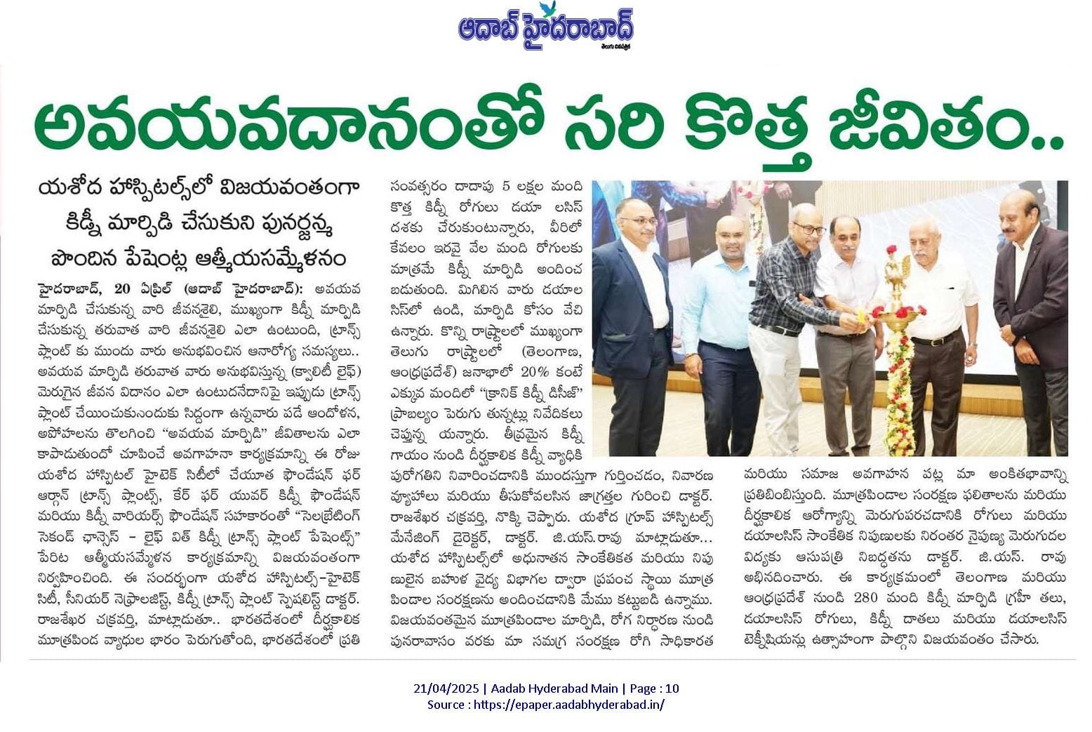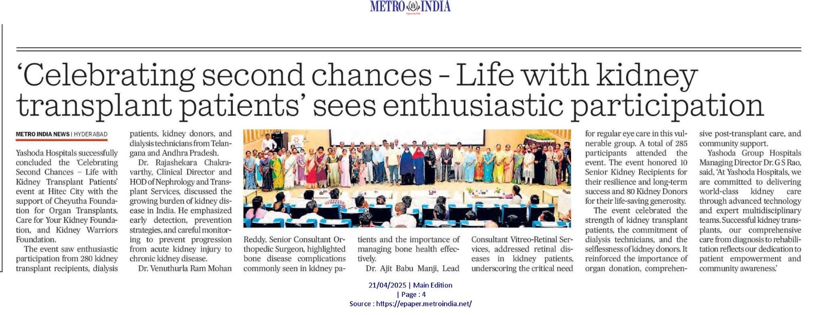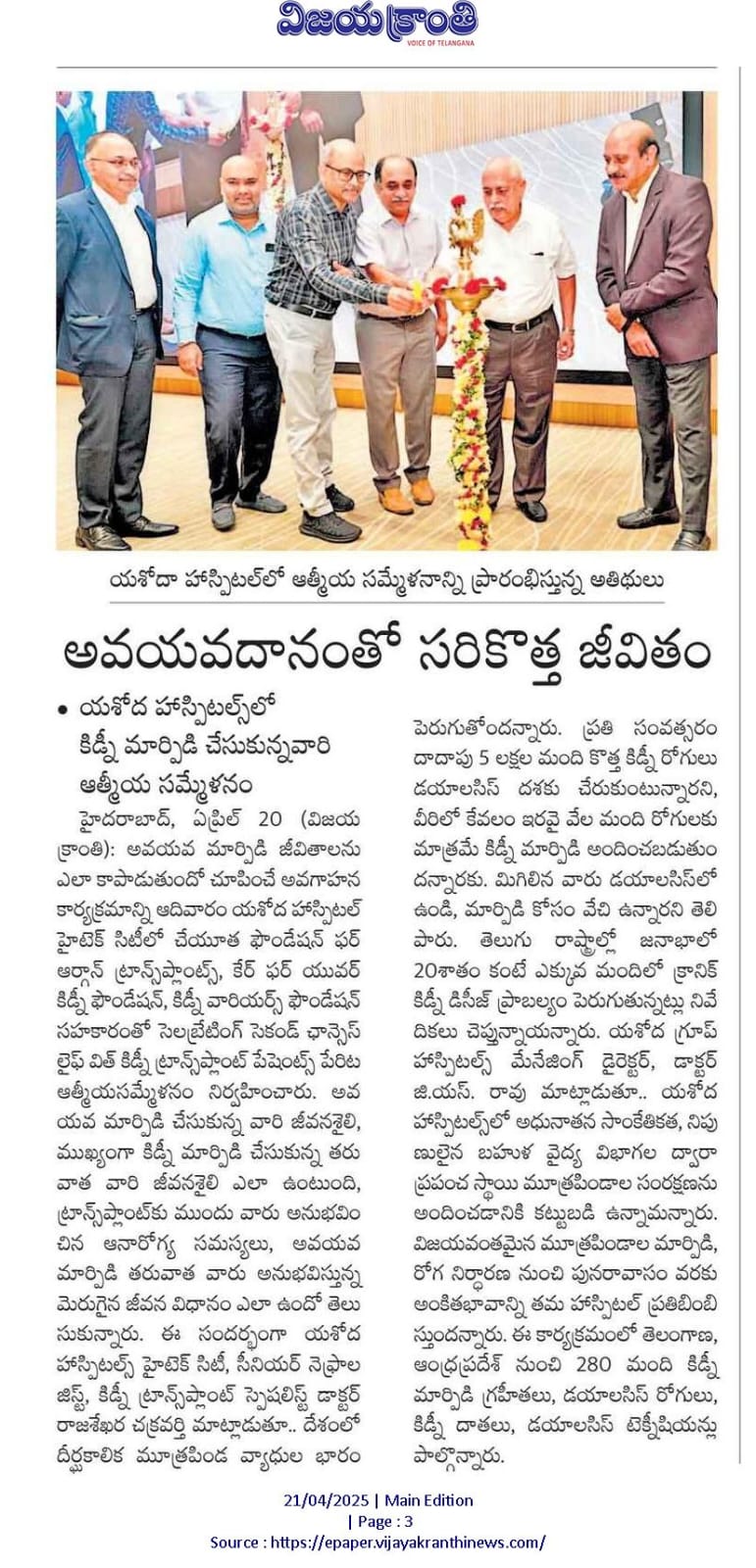 హైదరాబాద్, ఏప్రిల్ 20, 2025: అవయవ మార్పిడి చేసుకున్న వారి జీవనశైలి, ముఖ్యంగా కిడ్నీ మార్పిడి చేసుకున్న తరువాత వారి జీవనశైలి ఎలా ఉంటుంది? ట్రాన్స్ ప్లాంట్ కు ముందు వారు అనుభవించిన ఆనారోగ్య సమస్యలు, అవయవ మార్పిడి తరువాత వారు అనుభవిస్తున్న (క్వాలిటీ లైఫ్) మెరుగైన జీవన విధానం ఎలా ఉంటుదనే దానిపై ఇప్పుడు ట్రాన్స్ ప్లాంట్ చేయించుకునేందుకు సిద్దంగా ఉన్నవారు పడే ఆందోళన, అపోహలను తొలగించి “అవయవ మార్పిడి” జీవితాలను ఎలా కాపాడుతుందో చూపించే అవగాహనా కార్యక్రమాన్ని ఈరోజు యశోద హాస్పిటల్ హైటెక్ సిటీలో, చేయూత ఫౌండేషన్ ఫర్ ఆర్గాన్ ట్రాన్స్ ప్లాంట్స్, కేర్ ఫర్ యువర్ కిడ్నీ ఫౌండేషన్ మరియు కిడ్నీ వారియర్స్ ఫౌండేషన్ సహకారంతో “సెలబ్రేటింగ్ సెకండ్ ఛాన్సెస్ – లైఫ్ విత్ కిడ్నీ ట్రాన్స్ ప్లాంట్ పేషెంట్స్” పేరిట ఆత్మీయసమ్మేళన కార్యక్రమాన్ని విజయవంతంగా నిర్వహించింది.