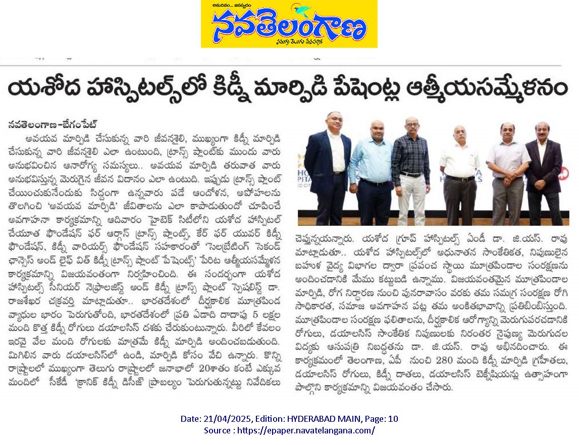 యశోద గ్రూప్ హాస్పిటల్స్ మేనేజింగ్ డైరెక్టర్, డాక్టర్. జి.యస్. రావు మాట్లాడుతూ “యశోద హాస్పిటల్స్ లో అధునాతన సాంకేతికత మరియు నిపుణులైన బహుళ వైద్య విభాగాల ద్వారా ప్రపంచ స్థాయి మూత్రపిండాల సంరక్షణను అందించడానికి మేము కట్టుబడి ఉన్నాము. విజయవంతమైన మూత్రపిండాల మార్పిడి, రోగ నిర్ధారణ నుండి పునరావాసం వరకు మా సమగ్ర సంరక్షణ, రోగి సాధికారత మరియు సమాజ అవగాహన పట్ల మా అంకితభావాన్ని ప్రతిబింబిస్తుంది.” అన్నారు. మూత్రపిండాల సంరక్షణ ఫలితాలను మరియు దీర్ఘకాలిక ఆరోగ్యాన్ని మెరుగుపరచడానికి రోగులు మరియు డయాలసిస్ సాంకేతిక నిపుణులకు నిరంతర నైపుణ్య మెరుగుదల విద్యకు ఆసుపత్రి నిబద్ధతను డాక్టర్. జి.యస్. రావు అభినదించారు.